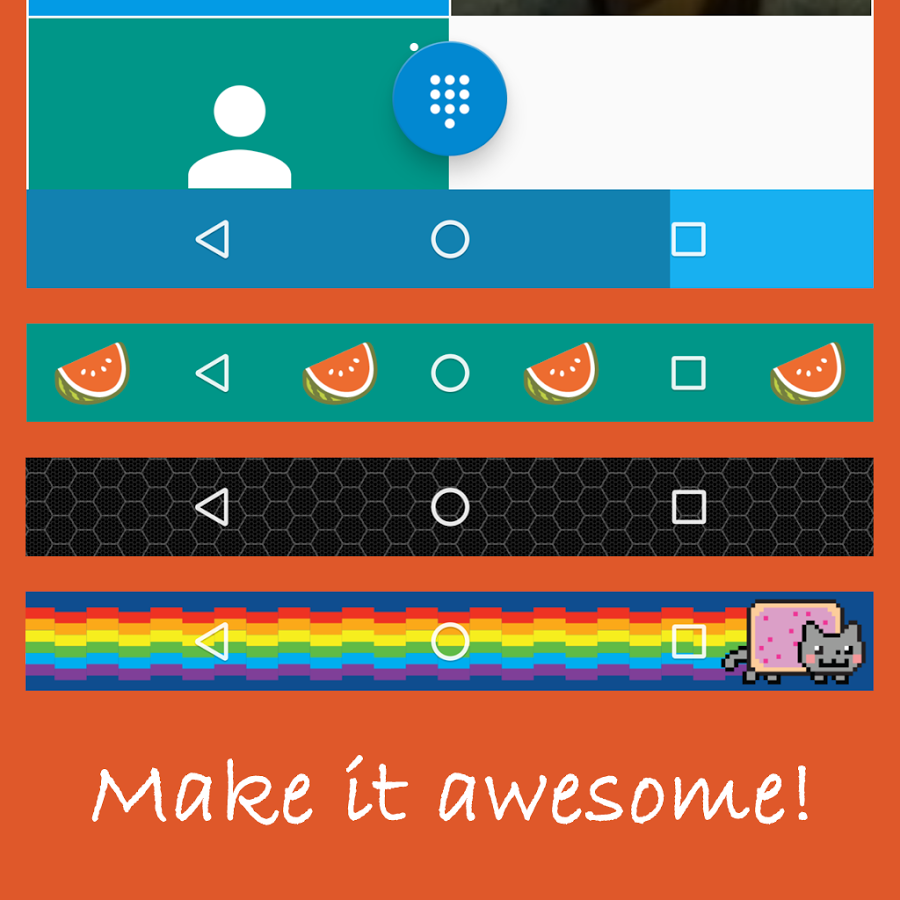 Turn it blue, make it red - anything you want. Select cool image as background or match color automatically to fit it to running app. Whatever you choose, it will be awesome! And then add some data, like battery level. All of that with Navbar Apps!
